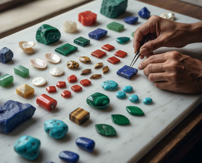 Semi-precious stones from across the world bring life and color to each design. Lapis Lazuli, Malachite, Mother of Pearl, Paua Shell, Jade, Coral, Jasper, Tiger Eye, Carnelian, and Turquoise—each stone is handpicked for its depth, shine, texture, and character. Our artisans select stones from India, Afghanistan, Bolivia, Namibia, Brazil, Myanmar, New Zealand, Chile, and other regions known for their natural beauty. Every stone is chosen to perfectly complement the artwork’s harmony and visual flow.