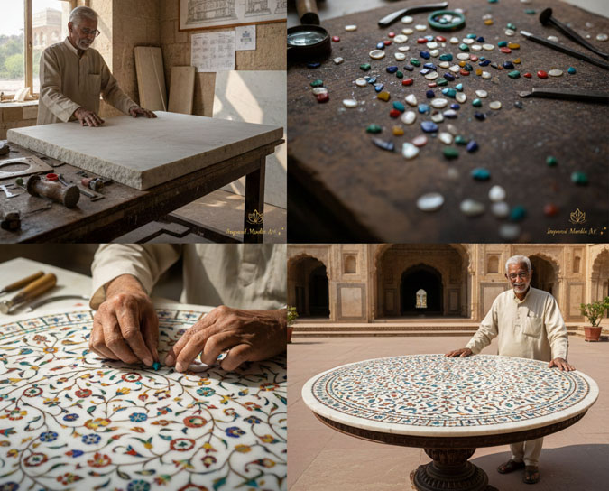 Once selected, the stones are sliced into delicate pieces. Using precision tools, they are ground on a rotating disc made from carborundum, shellac, and coarse sand. Every petal, leaf, vine, and geometric motif is shaped by hand—sometimes taking hours for a single element. Each artisan focuses on one motif at a time, guided by the watchful experience of the master craftsman, the ustad, ensuring perfection in every curve.