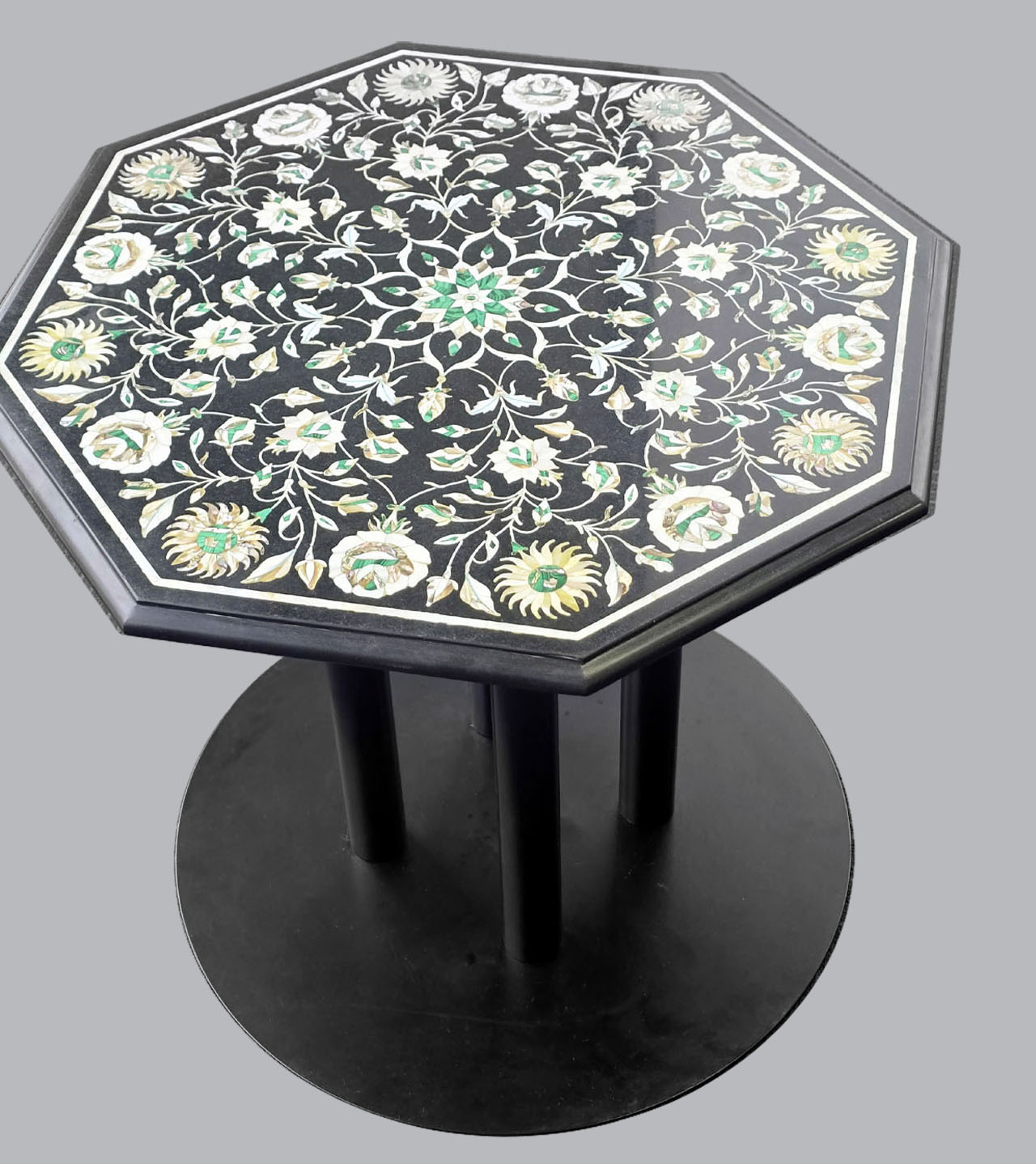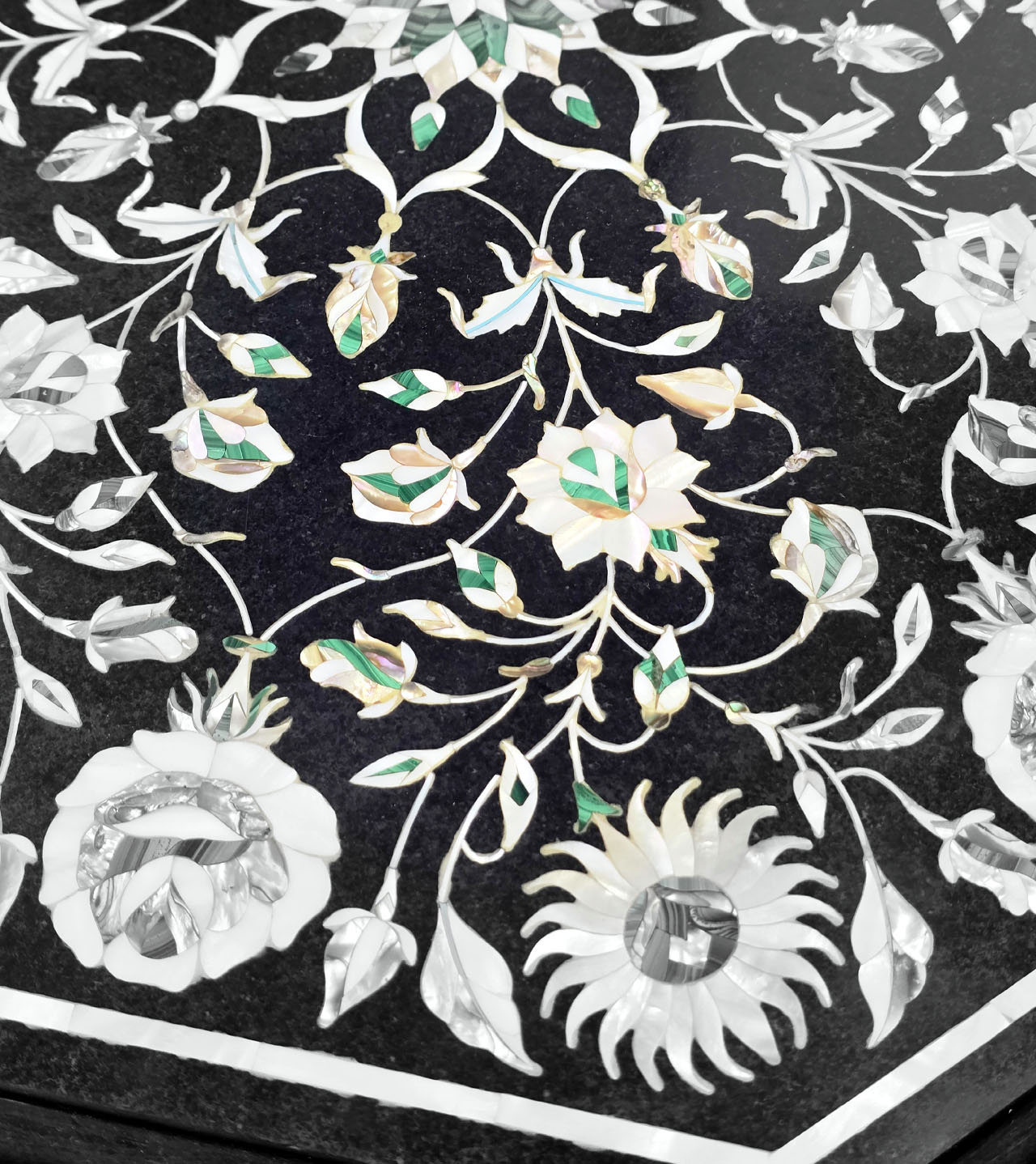 This exquisite octagon-shaped marble inlay side tabletop is handcrafted on rich black marble and adorned with intricate floral patterns in shimmering Mother of Pearl. Delicate vines and blossoms flow symmetrically across the surface, highlighted by vibrant green malachite accents and elegant brass sunburst details. Each element is individually hand-cut and carefully inlaid by master artisans, then polished to a smooth, lustrous finish. A timeless accent piece that blends regal artistry with refined luxury, perfect for elegant interiors.