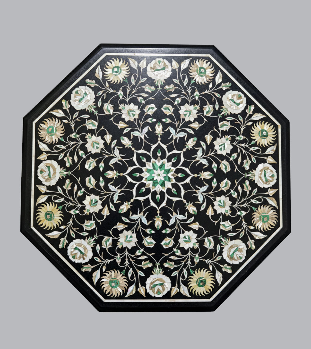 This elegant octagon-shaped marble inlay tabletop is handcrafted on premium Makrana white marble and adorned with flowing ornamental patterns in natural Mother of Pearl. The shimmering shell inlay creates a rich, iridescent effect, enhanced by subtle red jasper accents for contrast. Each piece is carefully hand-cut and inlaid by skilled artisans, then polished to a smooth finish. A refined statement piece that blends traditional craftsmanship with contemporary luxury, ideal for side or accent tables.