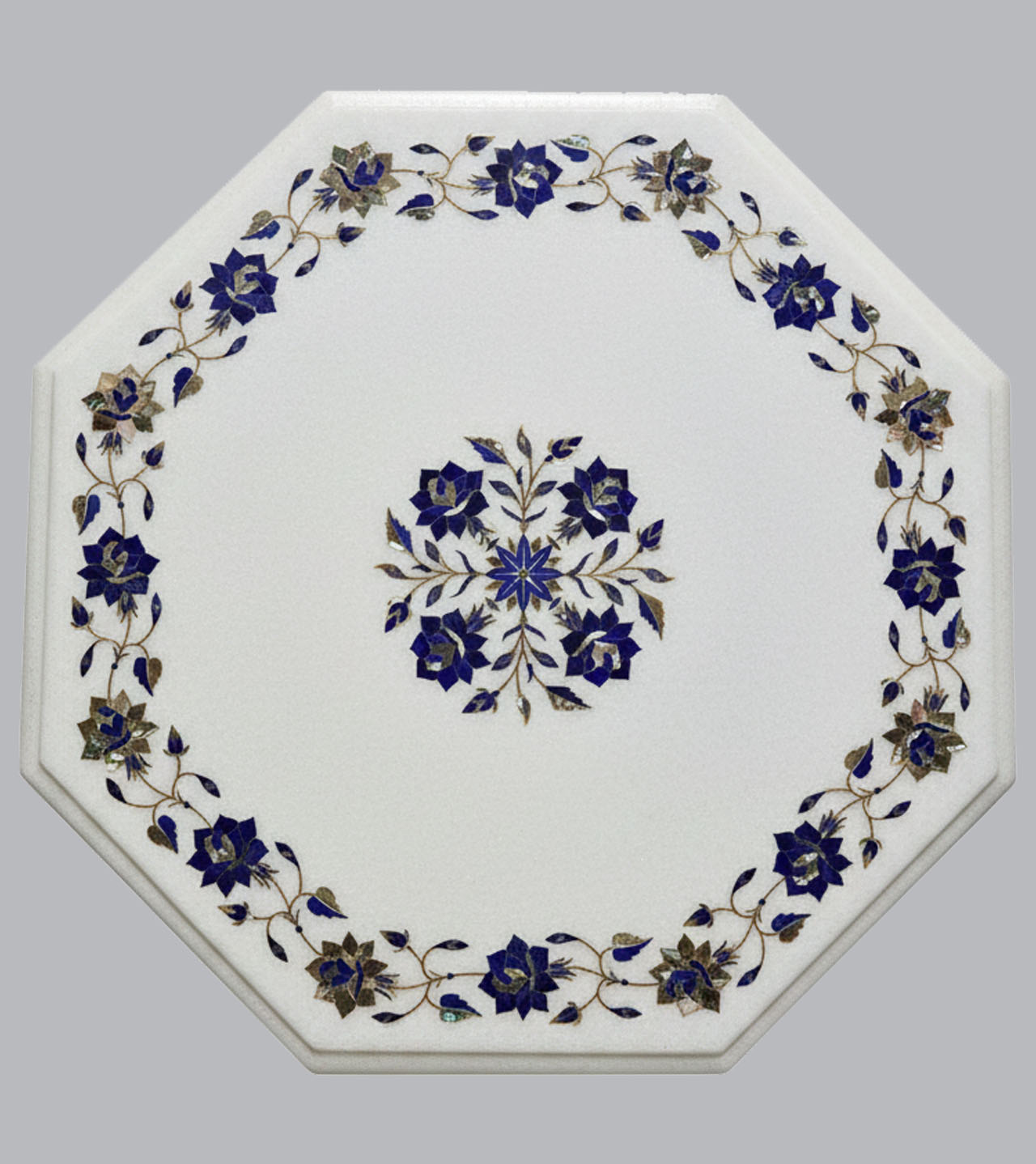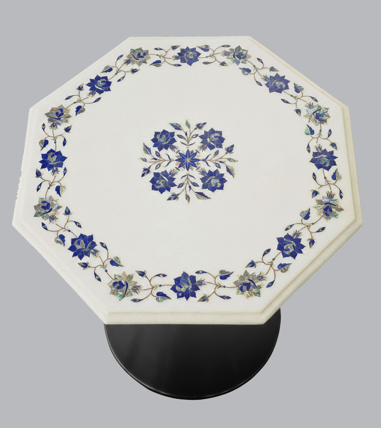 This elegant octagon-shaped marble inlay tabletop is handcrafted from premium Makrana white marble and delicately adorned with blue floral motifs. Natural lapis lazuli and shimmering Mother of Pearl are skillfully inlaid to form graceful vines and a central floral medallion. Each stone is hand-cut and precisely placed by master artisans, then finished with a smooth polish that enhances its natural beauty. A timeless accent piece that blends traditional craftsmanship with understated luxury, ideal for refined interiors.